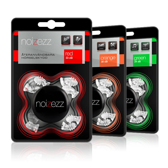 Noizezz hörselskydd dämpar bullret utan att synas eller vara i vägen. De är tillverkade i transparent silikon och har en unik design som helt saknar utstickande delar. Därför kan du använda dem under hjälmen – men även på nattklubben utan att det märks. Välj mellan följande dämpning (SNR).