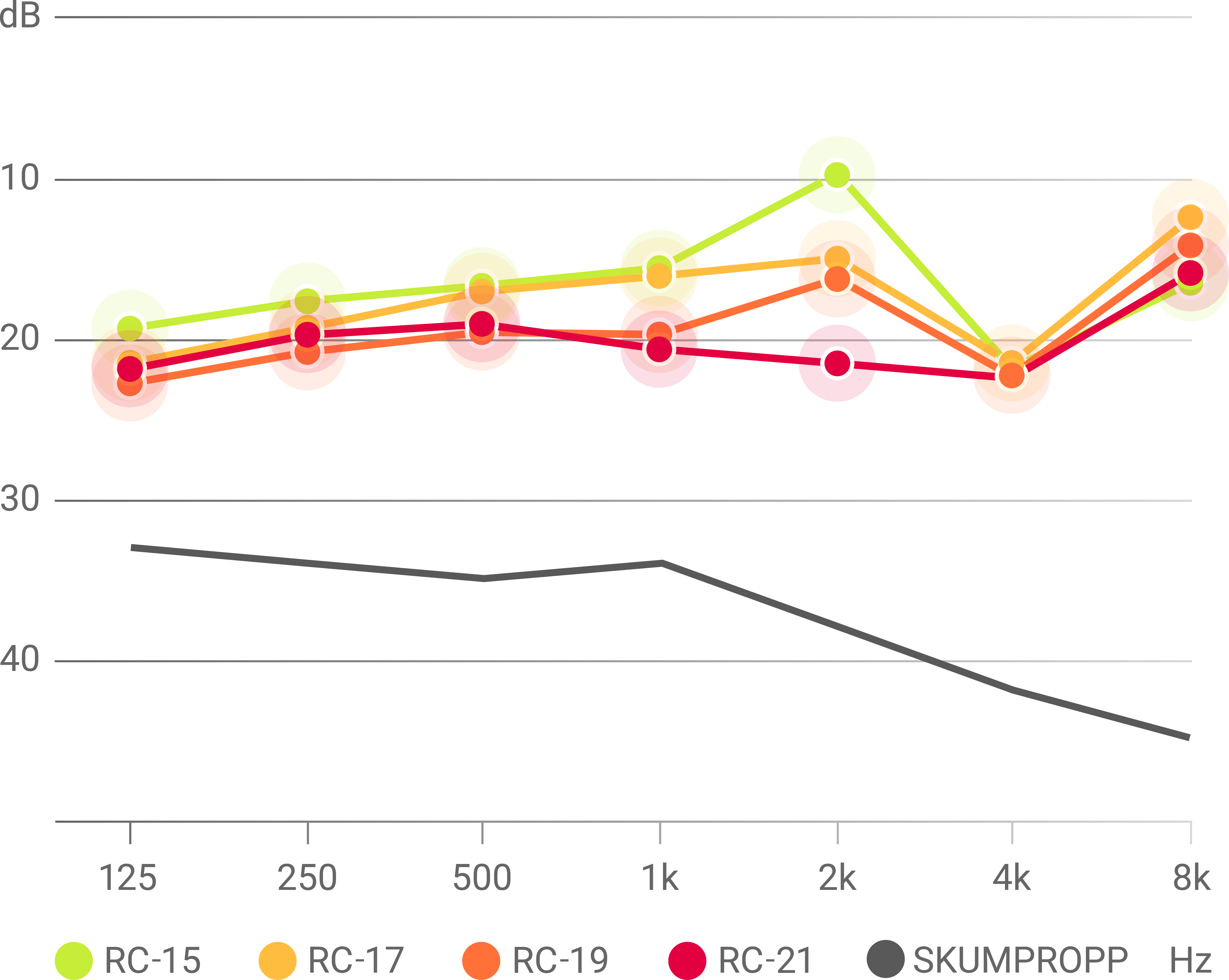 Medeldämpning, APV, i decibel över olika frekvenser.